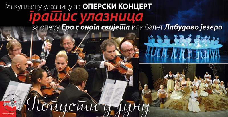 Куповином улазнице за КОНЦЕРТ СОЛИСТА, ОРКЕСТРА И ХОРА ОПЕРЕ СРПСКОГ НАРОДНОГ ПОЗОРИШТА, поводом 21. јуна, Светског дана музике, добија се гратис улазница за оперу ЕРО С ОНОГА СВИЈЕТА или балет ЛАБУДОВО ЈЕЗЕРО.