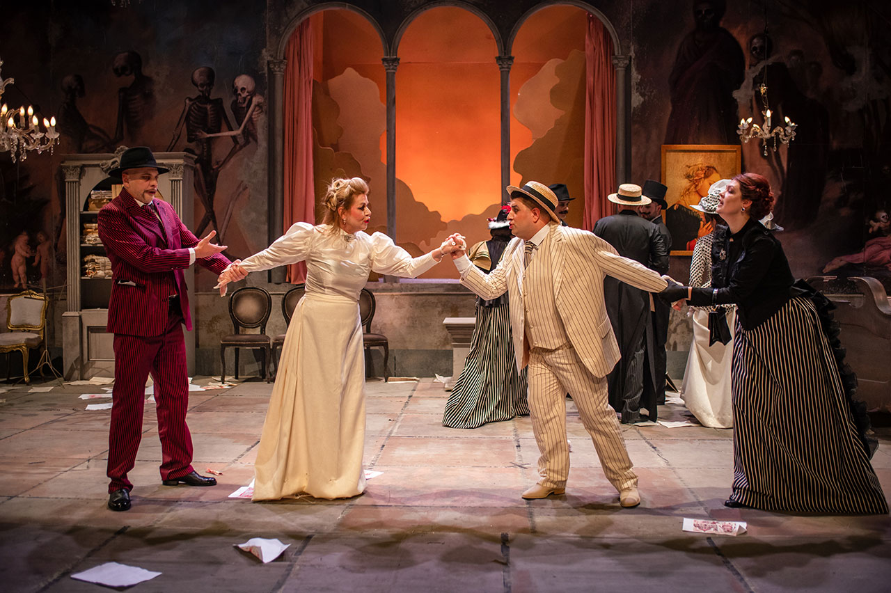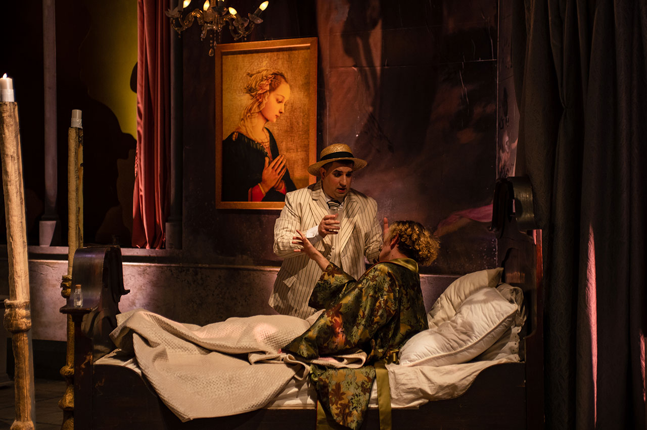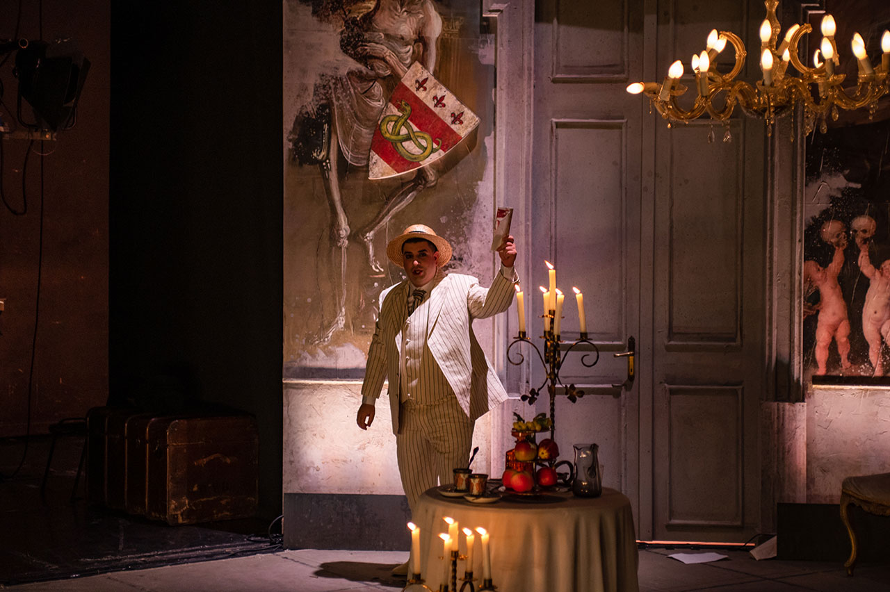 Фреске у сценографији су директни цитати фресака из чувеног комплекса катедрале у Пизи „Тријумф смрти“ и „Страшни суд“ сликара Франческа Траинија и Бонамика Буфалмака. Уметници и фреске су савременици историјских ди Донатијевих и Ђанија Скикија. Као цитат су коришћени и детаљи слике „Алегорија човековог избора између врлине и греха“ Франса Фанкена, као и позноготички „Плес смрти“ из катедрале у Либеку сликара Берна Ноткеа.