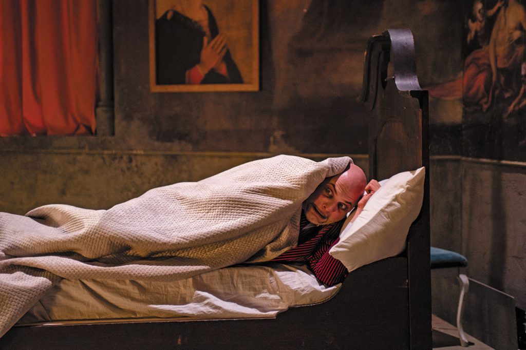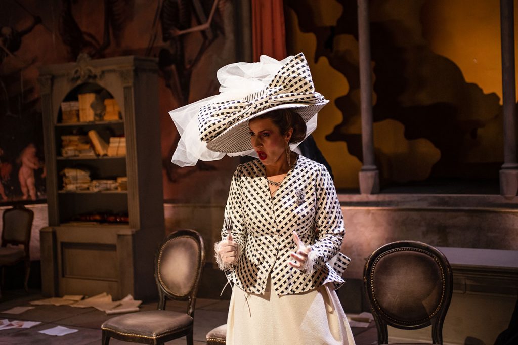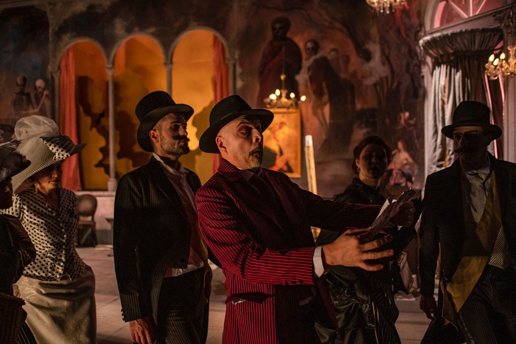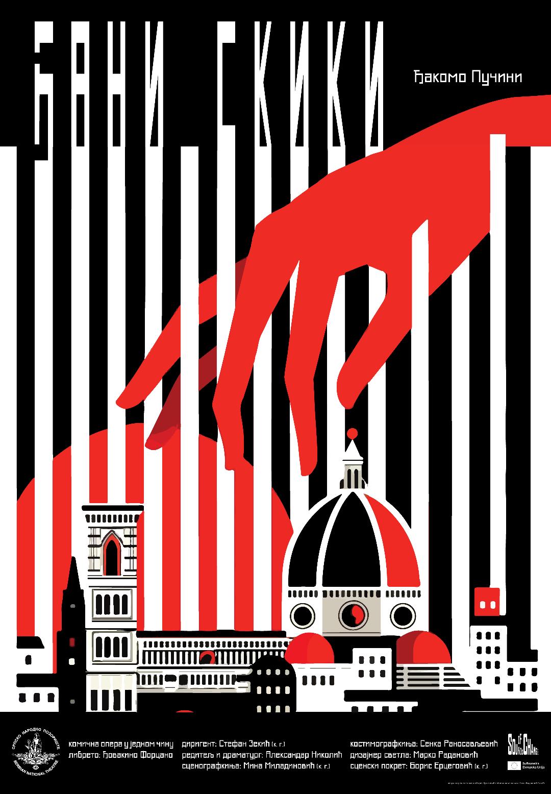 Фреске у сценографији су директни цитати фресака из чувеног комплекса катедрале у Пизи „Тријумф смрти“ и „Страшни суд“ сликара Франческа Траинија и Бонамика Буфалмака. Уметници и фреске су савременици историјских ди Донатијевих и Ђанија Скикија. Као цитат су коришћени и детаљи слике „Алегорија човековог избора између врлине и греха“ Франса Фанкена, као и позноготички „Плес смрти“ из катедрале у Либеку сликара Берна Ноткеа.